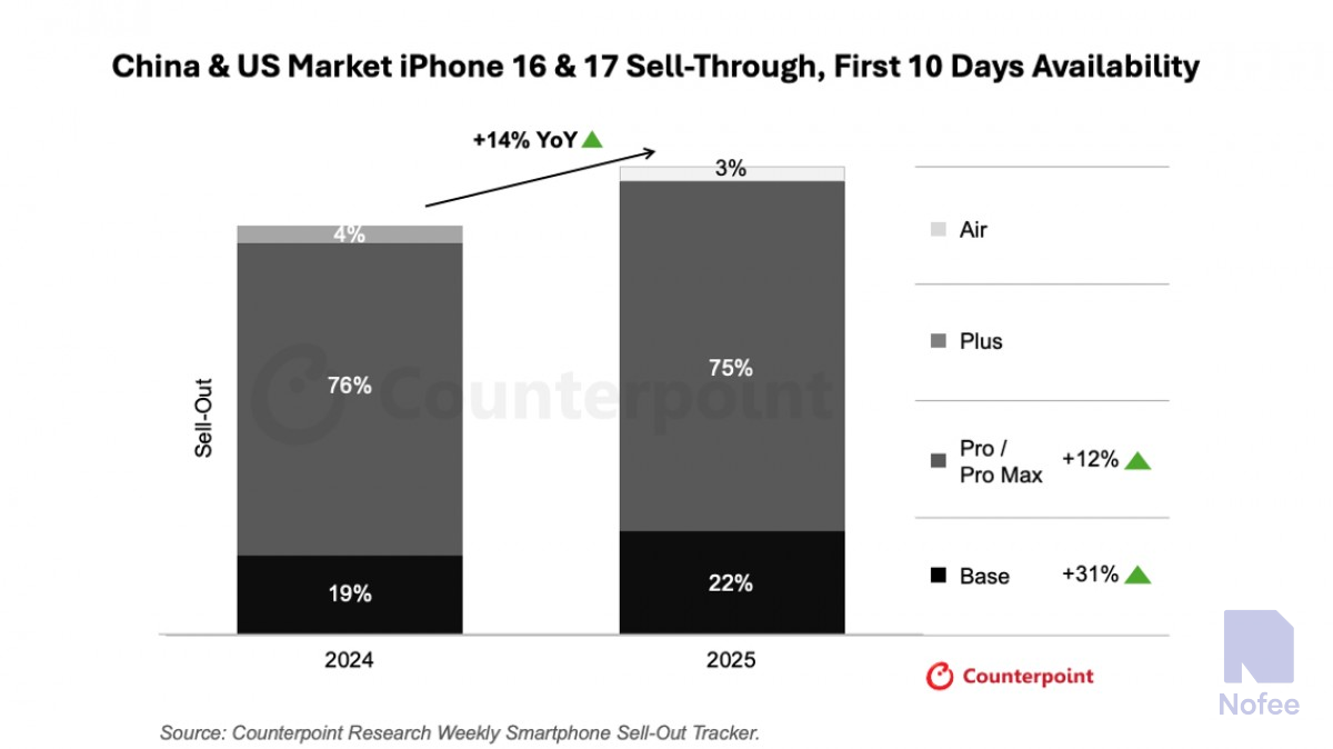 중국과 미국에서 첫 10일간의 판매량을 비교해보면, 아이폰 17 시리즈가 전년 동기 시점의 아이폰 16 시리즈보다 14% 더 많이 팔린 것으로 나타났다. 특히, 아이폰 17 Pro와 아이폰 17 Pro Max 모델은 이전 모델인 아이폰 16 Pro/Pro Max보다 12% 더 잘 팔렸고, 베이스 모델인 아이폰 17도 아이폰 16보다 31% 더 인기있는 것으로 보인다.