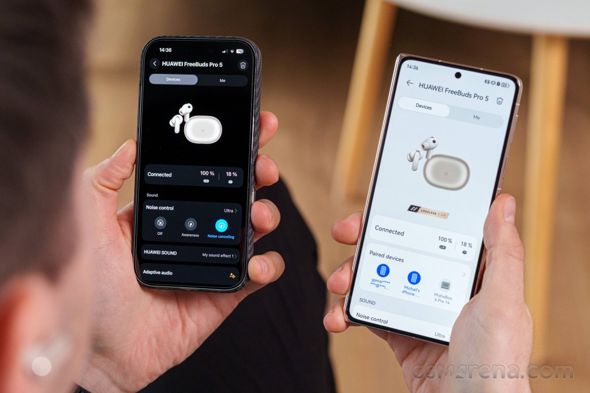프리버즈 프로 5는 이전 세대와 유사한 디자인을 유지하면서도 약간 더 작아진 크기로 진화했다. 줄기 양쪽이 좁아지고, 이어버드 무게는 쌍으로 5.5그램으로 줄었다. 케이스는 기존 모델과 크기 동일하지만 43그램으로 가벼워졌으며, 매끄러운 곡선과 컴팩트한 디자인으로 휴대성 향상에 기여한다. 케이스의 뚜껑은 단단한 클립으로 닫히며, 회전 메커니즘은 프리미엄 이어버드에 기대되는 견고함을 보여준다. 새로운 원형 LED 상태 표시줄은 페어링 모드 시 깜빡이는 하얀색, 연결 시 녹색, 배터리 감소 시 노란색, 완전히 소진 시 빨간색으로 표시된다. 리뷰 제품은 샌드 컬러로 제공되며, 이어버드는 밝은 회색, 케이스는 밝은 금색/샴페인 컬러를 적용했다. 착용감 측면에서는 실리콘 이어팁이 부드럽고 귀에 잘 맞는 것으로 평가받았다. 화웨이는 1만 개 이상의 인간 귀 분석과 1,000개 이상의 이어버드 디자인, 60개 이상의 이어팁 버전을 거쳐 최종 형태에 도달했다고 밝혔다. 다만, 이전 모델에 포함된 폼 이어팁은 이번 모델에서는 생략되었으며, 실리콘 이어팁이 더 편안하지만 폼 이어팁은 소음 차단 효과가 더 우수하다는 점이 특징이다.
