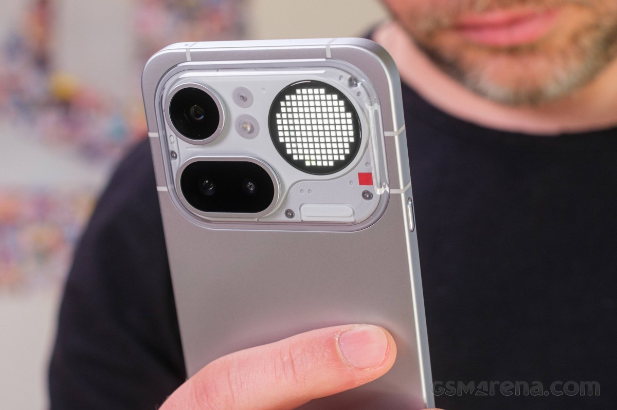 The flashiest comparison revolves around the Glyph interface - it's a simple Glyph bar on the non-Pro and a full-on circular dot matrix display on the Pro. Getting technical for a bit, the Pro has 137 LEDs, while the regular has just 63. As you can imagine, you can do all sorts of clever stuff with the Glyph Matrix on the Nothing Phone (4a) Pro - animating your timer, different callers, you can even use it as a selfie display for the main camera, though it's very hard to distinguish just what you're seeing.