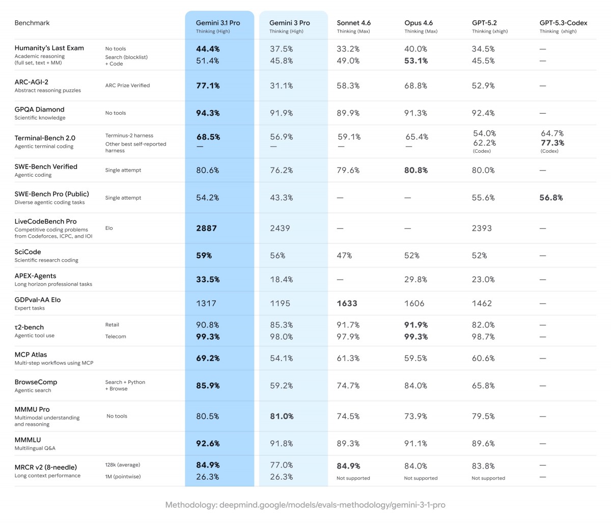 구글은 제미나이 3.1 프로의 성능이 "모델이 완전히 새로운 논리 패턴을 해결하는 능력을 평가하는 벤치마크"인 ARC-AGI-2에서 두드러진다고 강조했다. 보시는 바와 같이, 제미나이 3.1 프로는 이 벤치마크에서 우승했다.