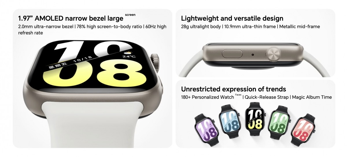 아울러 워치 X5i는 제3자 앱 지원 없이 실시간 운영체제(RTOS)를 기반으로 작동하는 피트니스 중심 스마트워치다. 이 제품은 390 x 450픽셀 해상도의 1.97인치 AMOLED 터치스크린, 60Hz 주사율, 항상 켜진 디스플레이(AOD) 기능을 갖춘다. 시계 밴드 포함 41그램의 무게를 갖는다. 금속 중간 프레임을 특징으로 하며, 1ATM 방수 인증을 받았다.