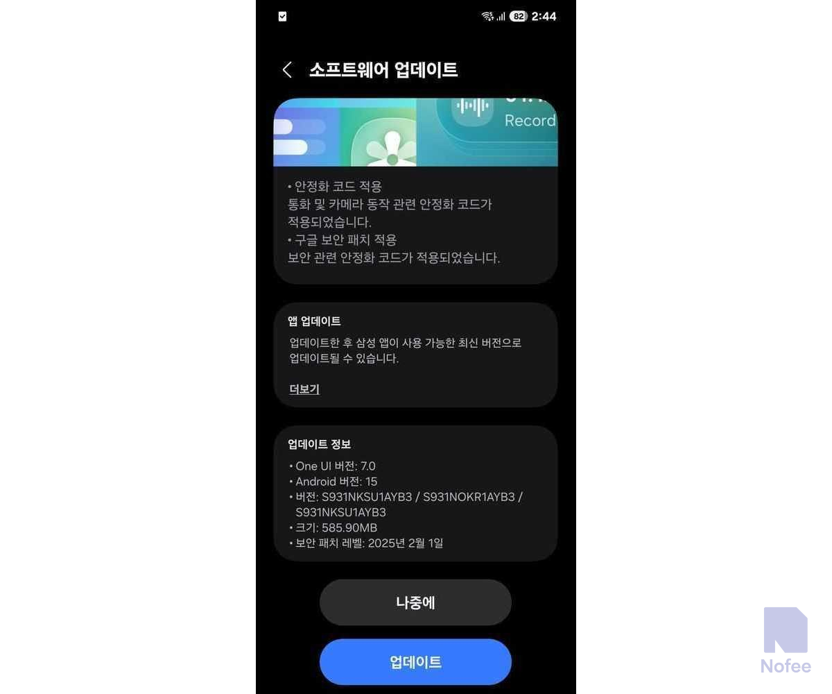 삼성 갤럭시 S25, 갤럭시 S25+, 및 갤럭시 S25 울트라이 오늘 첫 번째 소프트웨어 업데이트를 받았다. 빌드 번호는 한국에서 출시되기 시작한 S93xNKSU1AYB3로, 여기서 "x"는 세 전화기 각각에 관해 다른 숫자이다.