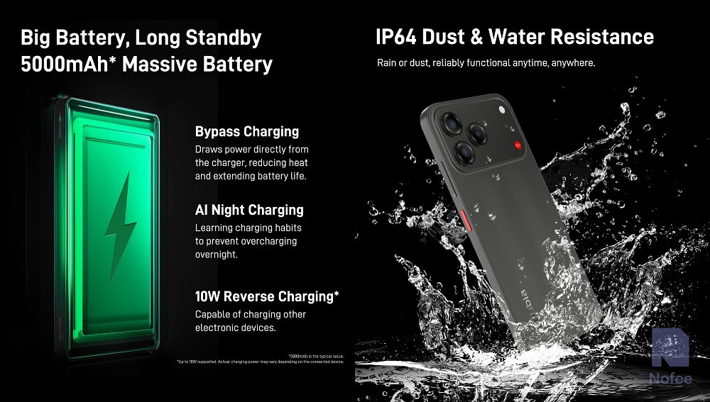 Nubia V80 디자인은 미드나잠 블랙(Midnight Black), 페일 앰버(Pale Amber), 셀라돈 시안(Celadon Cyan), 피치 퍼즈(Peach Fuzz) 등 4가지 색상으로 제공된다. 또한 본체는 IP64 등급(방진, 방수)이다.