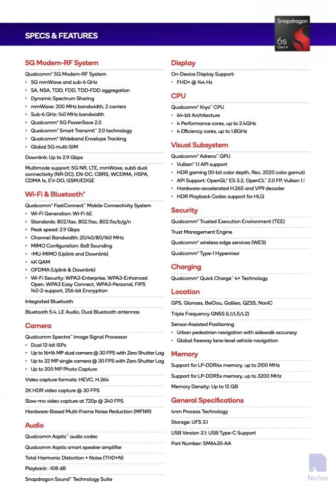 Qualcomm(QUALCOMM)은 최근 최신 미드레인지 칩셋인 스냅드래곤 6s 제네 4(SM6435)를 공개했다. 이 칩셋은 FHD+ 144Hz 디스플레이, 및 6GHz 미만 5G 및 Wi-Fi 6E 연결 지원과 함께 향상된 CPU와 GPU 성능을 제공한다.