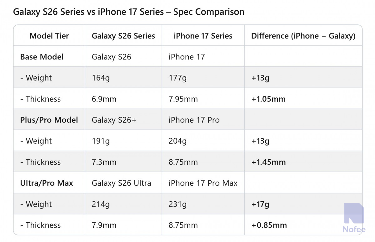 베이스 S26의 무게도 S25보다 2g 더 많은 164g이 될 것으로 예상된다. 이에 따라 갤럭시 S25와 S25+ 모델과 비교해 보았을 때, S26은 아이폰 17 시리즈보다 13g 더 가볍고 1mm 이상 더 얇다.