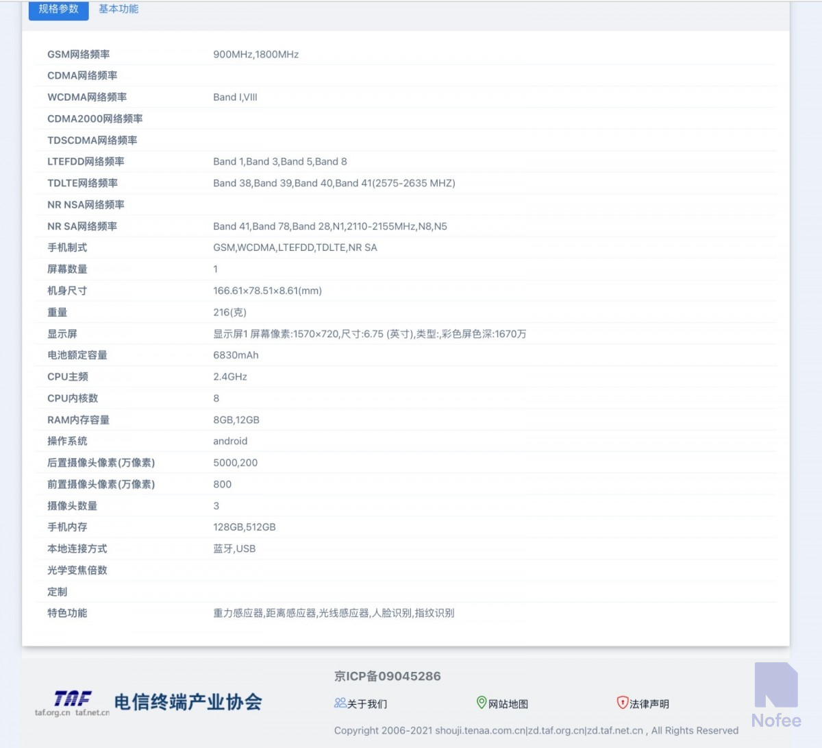 이 장치는 6.75인치 화면을 가지고 있으며, 해상도는 720x1570이다. RAM은 8GB 또는 12GB이며, 저장공간은 128GB 또는 512GB이다. 배터리 용량은 6,830mAh로, '정격' 용량이라면 결국 7,000mAh로 광고될 것이다.