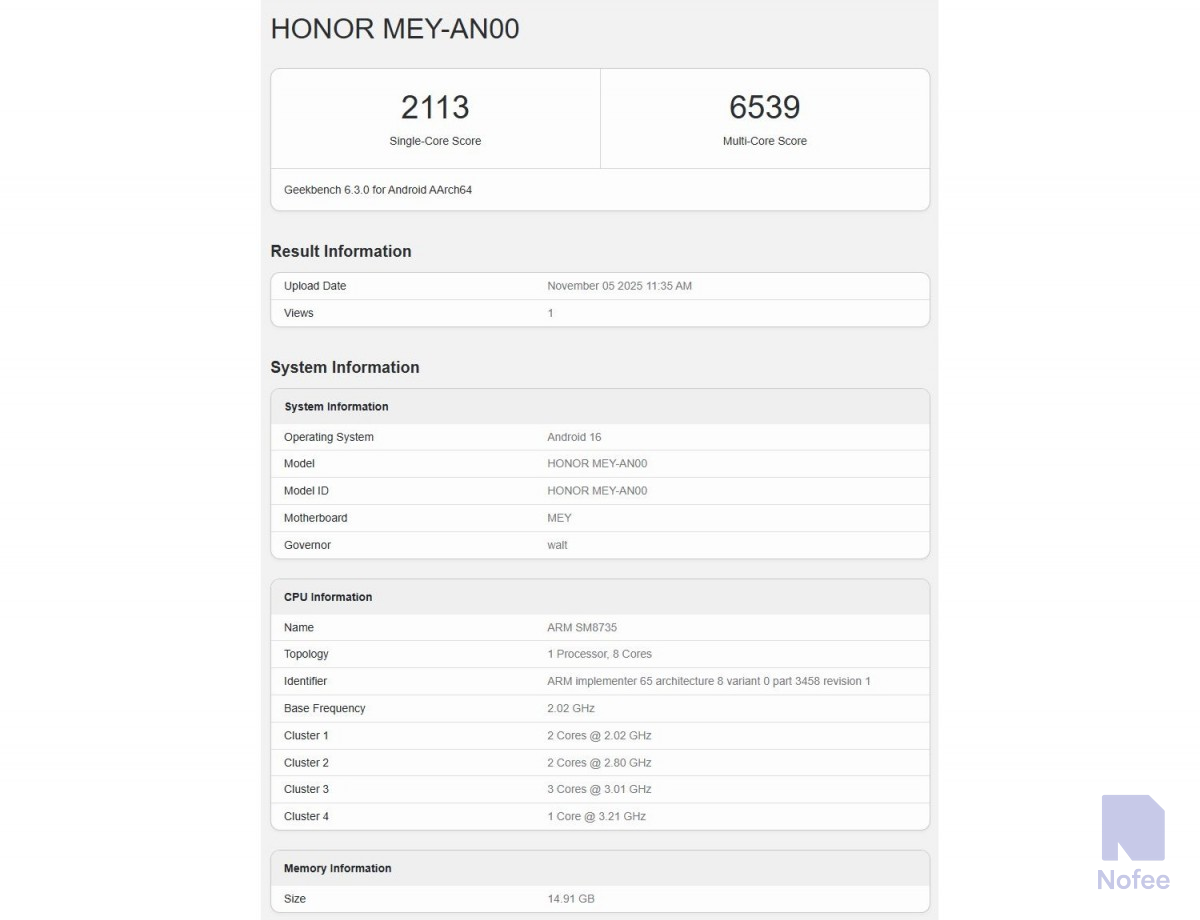 최근 아너의 새로운 스마트폰 모델인 아너 500관련 정보가 공개되었다. 이 기사에서는 아너 500의 Pro토타입이 Geekbench을 실행한 것을 확인했다. 이는 모델 번호 MEY00으로 식별된다.