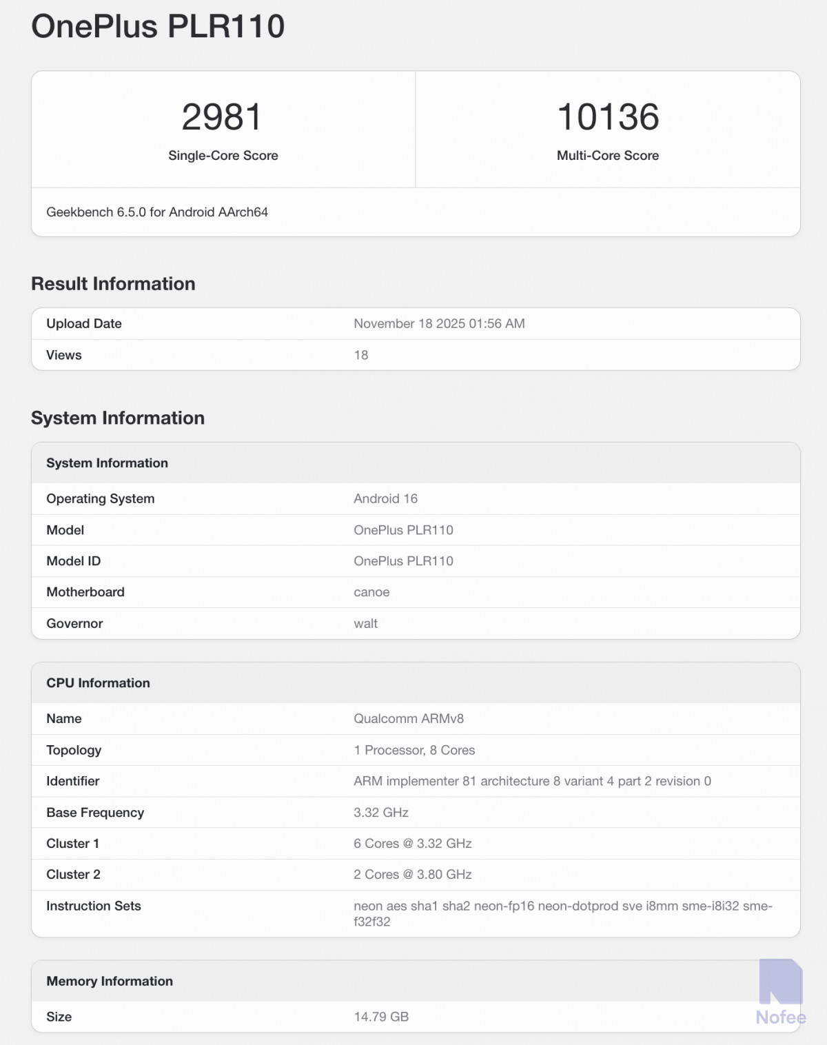 또한 Geekbench 웹사이트에서는 곧 출시될 Ace 6T이 될 것으로 예상되는 새로운 원플러스 휴대폰이 발견되었다. 모델 번호 PLR110을 탑재하고 Android 16을 실행하며 16GB RAM을 갖추고 있다. 이 전화기는 싱글 코어 테스트에서 2,981점, 멀티 코어 테스트에서 10,136점을 기록했다.