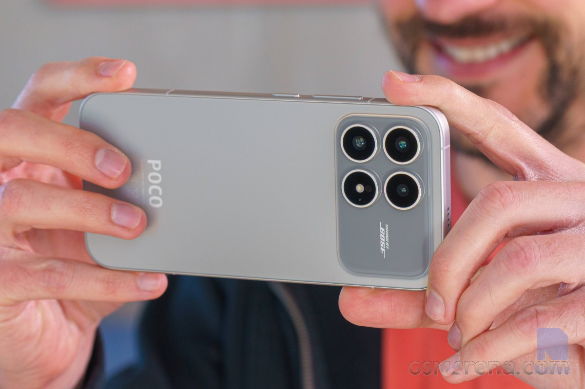 포코 F8 울트라의 뒷면에는 데님 블루 색상이 적용되어 있으며, 질감이 있는 패턴이 특징이다. 이 패턴은 실제로 데님 청바지를 모방한 것처럼 보이나, 손가락 아래에서는 고무에 더 가깝다. 또한, 뒷면에는 Bose 브랜드 스피커를 볼 수 있다.