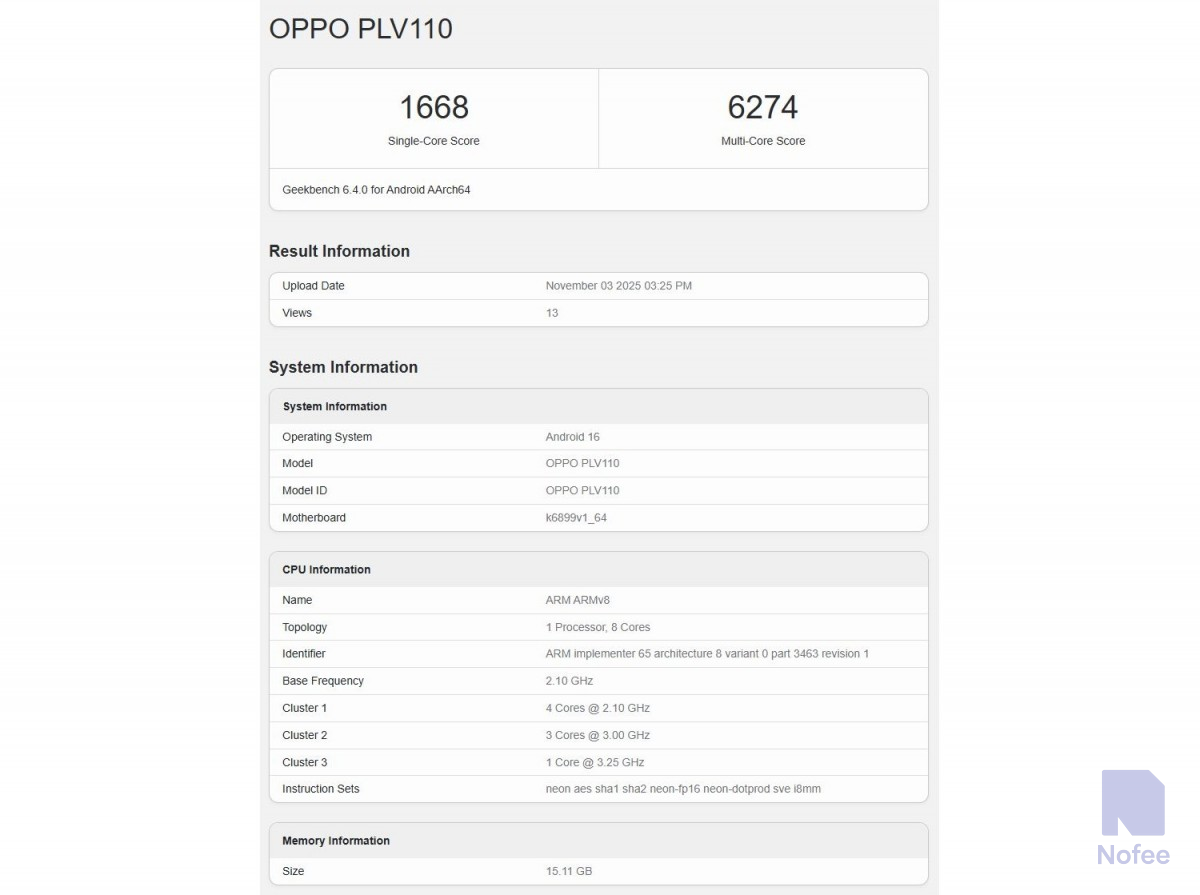 벤치마크 결과에 따르면, 문제의 Pro토타입은 1,668점의 단일 코어 점수와 6,274점의 멀티 코어 점수를 기록했다. 이 핸드셋은 미디어텍의 디멘시티 8450 SoC와 함께 16GB RAM을하고 있으며, 출시일에 ColorOS 16과 함께 Android 16을 실행할 예정이다.
