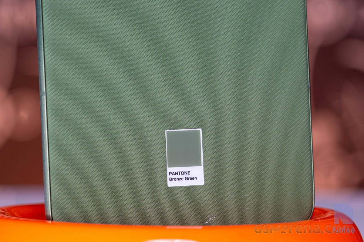 엣지 70의 디자인은 매우 매력적이다. 브론즈 그린 색상으로 제공되는 이 제품에는 브러시 처리된 알루미늄 프레임, 브러시 처리된 카메라 아일랜드 플레이트, 브러시 처리된 모토 로고가 있다. 나머지 후면 패널은 거친 천 같은 느낌의 나일론 질감 마감으로 되어 있어 시각적으로 매우 매력적이다.