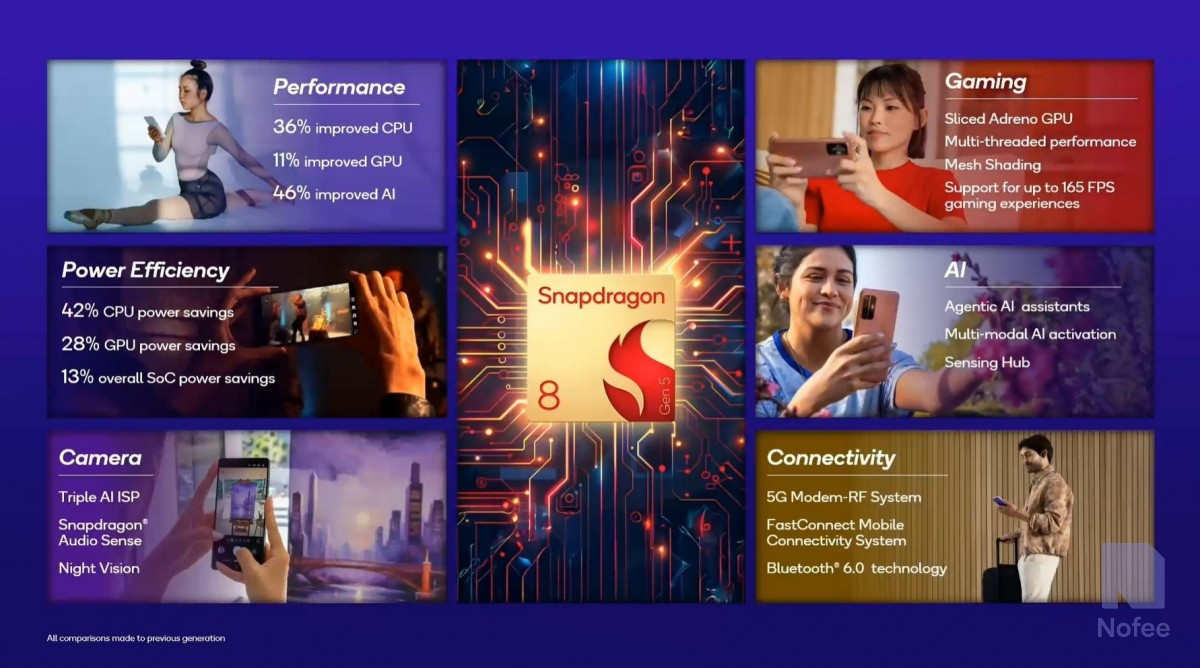 신형 스냅드래곤 8 제네5는 Elite 모델과 마찬가지로 3nm Pro세스로 제작되었으며 Qualcomm의 3세대 오라이온 CPU와 2x 프라임 코어, 6x 성능 코어를 탑재했다. 이 칩셋은 3.8GHz 클럭을 지원하며, 성능 측면에서 Qualcomm은 스냅드래곤 8 제네5가 2년 전 스냅드래곤 8 제네3 칩과 비교하여 CPU 작업이 36% 향상, GPU 출력이 11% 향상, AI 작업이 46% 향상, 전체 SoC 전력 절감이 13%를 약속한다.
