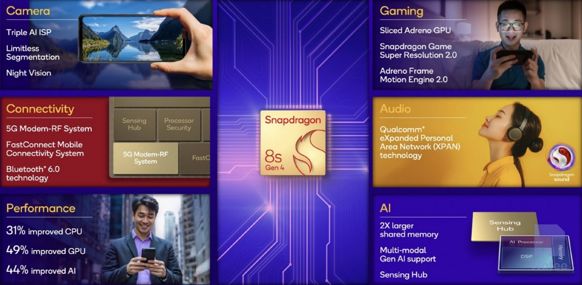 CPU 레이어는 최대 3.2GHz 클록의 Cortex4 프라임 코어 1개, 3.0GHz Cortex720 코어 3개, 2.8GHz Cortex720 코어 2개, 2.0GHz Cortex720 코어 2개로 구성된다. Qualcomm에 따르면 새로운 칩은 작년 스냅드래곤 8s Gen 3보다 31% 빠르며 39% 더 적은 전력을 소비한다.