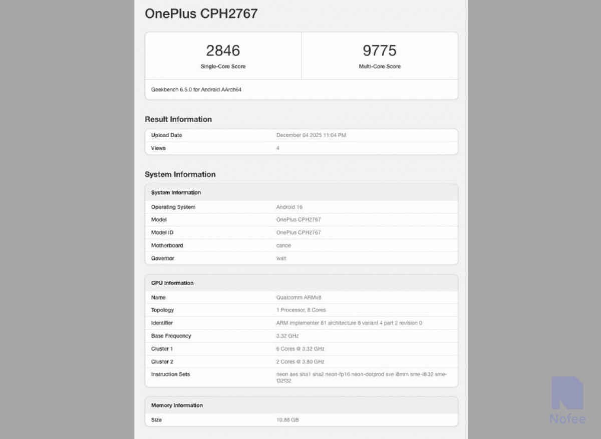 Geekbench에서 발견된 원플러스 장치의 모델 번호는 CPH2767이며, 15R로 여겨집다. 목록에는 12GB RAM으로 Android 16을 실행하는 것으로 표시되었다.