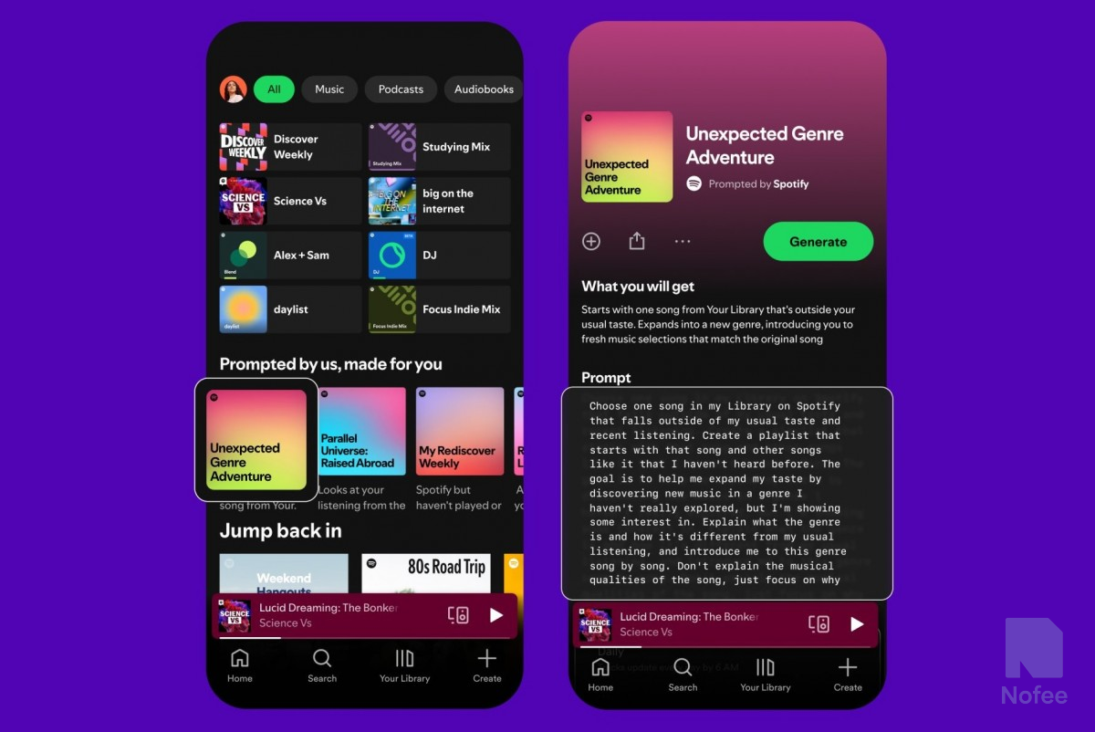 Spotify은 사용자의 전체 청취 기록을 활용하여 진정으로 개인화된 재생 목록을 생성한다. 각 노래 추천에 관해 사용자는 해당 노래가 선택된 이유관련 컨텍스트와 설명도 얻을 수 있다. 이 기능은 홈에서 개인화된 재생 목록을 생성하는 사전 설정된 프롬프트를 제공하기도 한다.