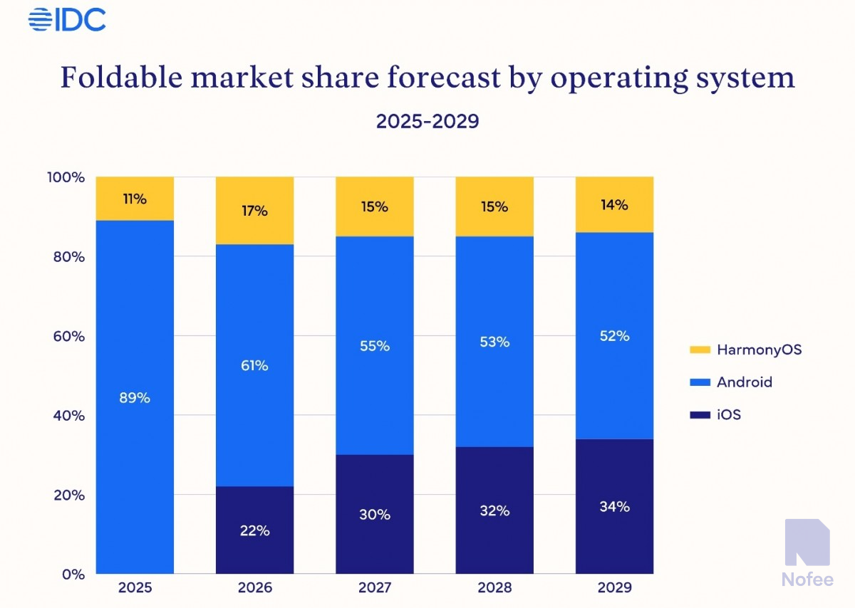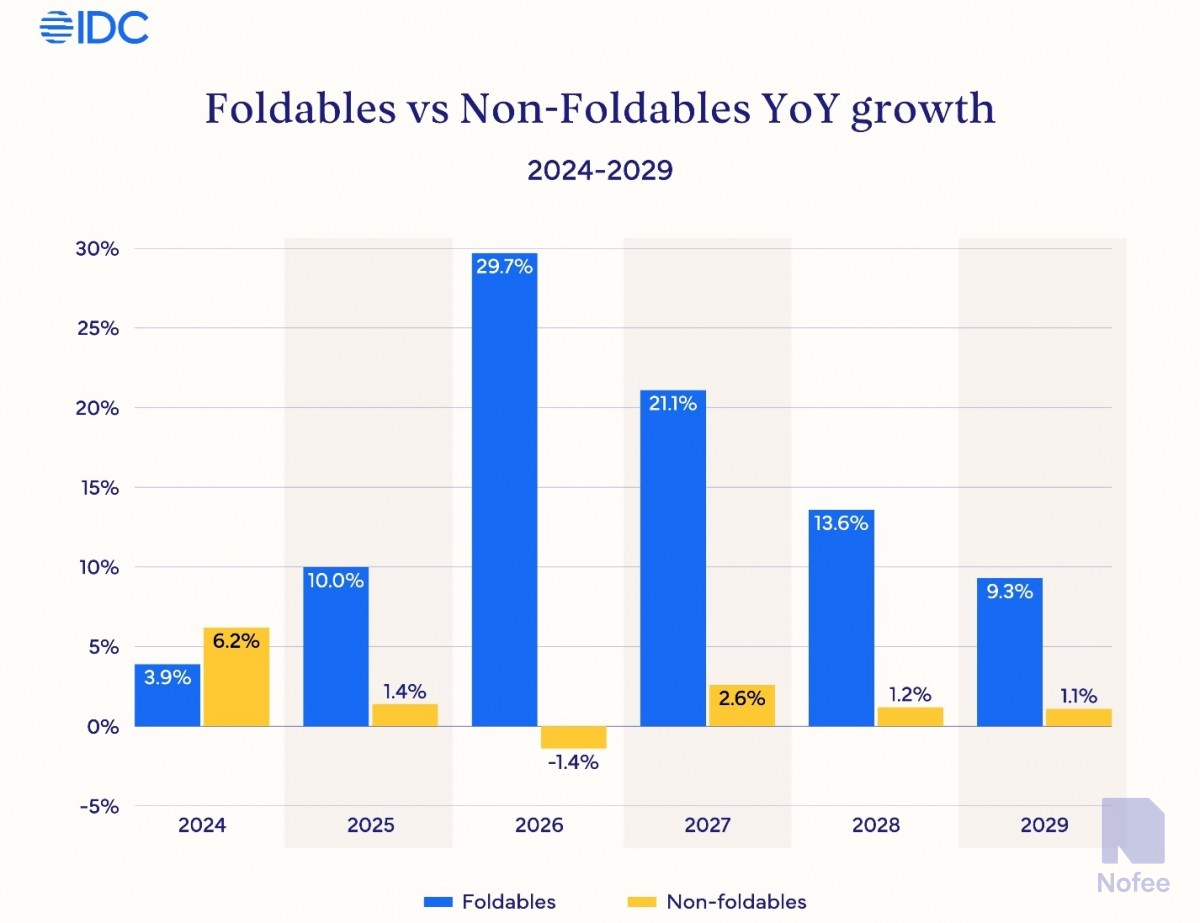 폴더블 아이폰은 2,400달러라는 소문으로 인해 폴더블 시장 가치의 34%를 차지할 것으로 예상된다. IDC에 따르면 폴더블 휴대폰은 2026년에도 계속해서 더 넓은 스마트폰 시장을 능가할 것이며, 2029년까지 전체 가치의 10% 이상을 차지할 것으로 예상된다.