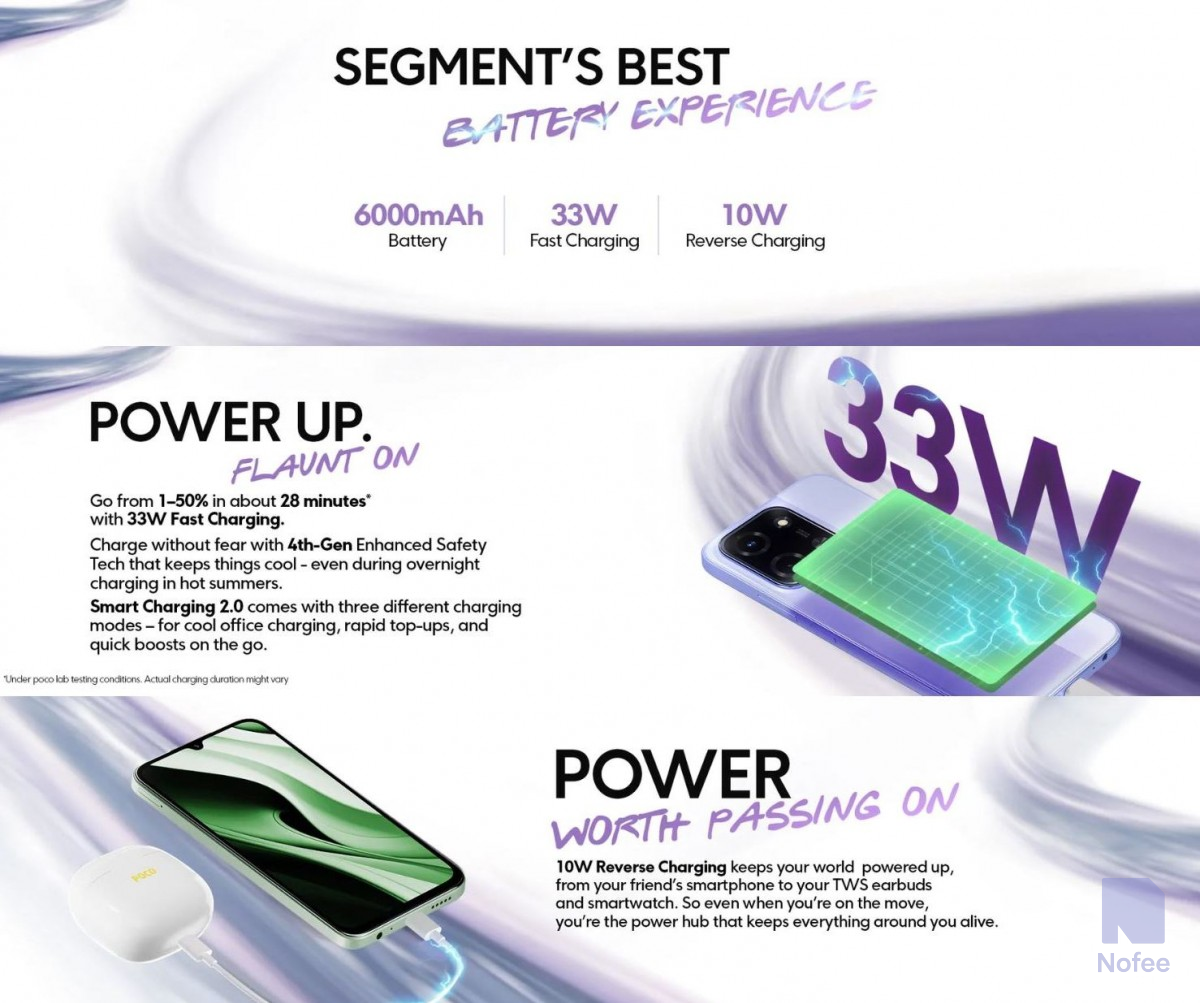이 장치에는 6,000mAh 배터리가 탑재되어 있으며, 33W의 빠른 충전과 10W의 역방향 충전을 지원한다. 포코은 이러한 사양은 "부문 최고의 배터리 경험"을 제공한다고 밝혔다.