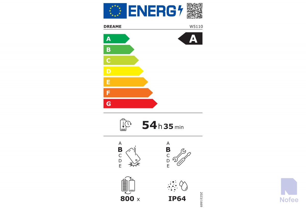 EPREL 라벨(아래 참조)은 에너지 효율성을 A로 분류하고 낙하 방지 및 수리 가능성을 B로 분류한다. 배터리가 초기 용량의 80% 미만으로 떨어지기 전까지 800번의 충전 주기를 견딜 수 있다고 약속되었다.