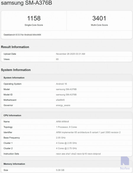 벤치마크 데이터베이스에 따르면 모델 코드 SM376B을 포함하는 삼성 갤럭시 A37이 엑시노스 1480 칩으로 구동될 것으로 나타났다. Geekbench 테스트를 실행한 장치는 Android 16을 실행하고 6GB RAM이 내장되어 있었지만 고객이 선택할 수 있는 옵션이 더 많을 가능성이 높다.