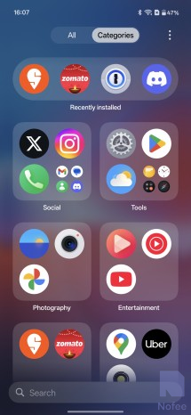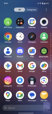 앱 얘기가 나와서 말인데, 이제 새로운 앱 서랍도 있다. 전체 앱 보기와 iOS 스타일 분류 간에 전환할 수 있으며, 옆으로 스와이프하여 둘 사이를 쉽게 전환할 수 있다. 검색창이 하단의 좀 더 편리한 위치로 이동되었다.