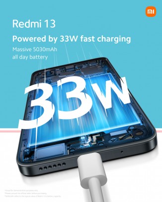 레드미 13에는 FHD+ 해상도의 넓은 6.79인치 LCD이 장착되어 있으며, 이전 제품과 마찬가지로 90Hz에서 실행된다. 밝기는 550니트로 최고조에 달하며 DC 디밍으로 제어된다.